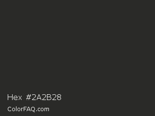 Hex #2a2b28 Color is a very dark green color and the nearest color is Heavy Metal #2b3228. Hex code #2a2b28 and RGB value is rgb(42,43,40). In RGB color space, this color is composed of 16% red, 17% green, 16% blue, In CMYK color space, this color is composed of 2% cyan, 0% magenta, 7% yellow , 83% black , In HSL color space, this color has a hue angle of 80° , 4% saturation and 16% lightness.