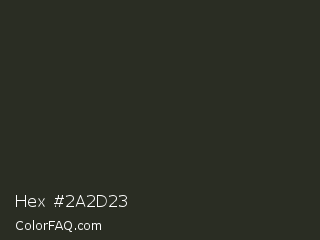 Hex #2a2d23 Color is a very dark lime color and the nearest color is Rangitoto #2e3222. Hex code #2a2d23 and RGB value is rgb(42,45,35). In RGB color space, this color is composed of 16% red, 18% green, 14% blue, In CMYK color space, this color is composed of 7% cyan, 0% magenta, 22% yellow , 82% black , In HSL color space, this color has a hue angle of 78° , 13% saturation and 16% lightness.