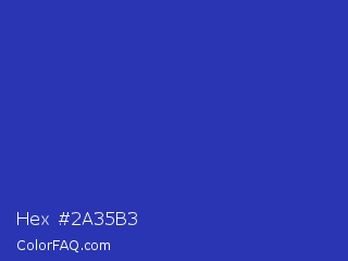 Hex #2a35b3 Color is a normal blue color and the nearest color is Governor Bay #2f3cb3. Hex code #2a35b3 and RGB value is rgb(42,53,179). In RGB color space, this color is composed of 16% red, 21% green, 70% blue, In CMYK color space, this color is composed of 77% cyan, 70% magenta, 0% yellow , 30% black , In HSL color space, this color has a hue angle of 235° , 62% saturation and 43% lightness.