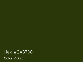 Hex #2a3708 Color is a very dark lime color and the nearest color is Turtle Green #2a380b. Hex code #2a3708 and RGB value is rgb(42,55,8). In RGB color space, this color is composed of 16% red, 22% green, 3% blue, In CMYK color space, this color is composed of 24% cyan, 0% magenta, 85% yellow , 78% black , In HSL color space, this color has a hue angle of 77° , 75% saturation and 12% lightness.