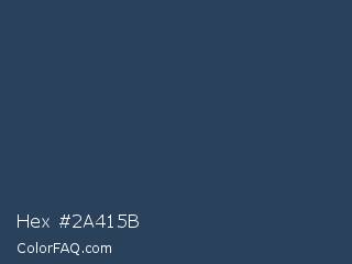 Hex #2a415b Color is a dark blue color and the nearest color is Pickled Bluewood #314459. Hex code #2a415b and RGB value is rgb(42,65,91). In RGB color space, this color is composed of 16% red, 25% green, 36% blue, In CMYK color space, this color is composed of 54% cyan, 29% magenta, 0% yellow , 64% black , In HSL color space, this color has a hue angle of 212° , 37% saturation and 26% lightness.