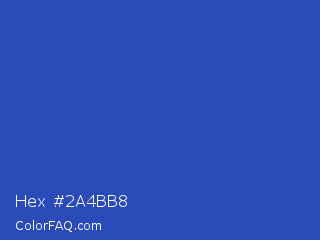 Hex #2a4bb8 Color is a normal blue color and the nearest color is Cerulean Blue #2a52be. Hex code #2a4bb8 and RGB value is rgb(42,75,184). In RGB color space, this color is composed of 16% red, 29% green, 72% blue, In CMYK color space, this color is composed of 77% cyan, 59% magenta, 0% yellow , 28% black , In HSL color space, this color has a hue angle of 226° , 63% saturation and 44% lightness.