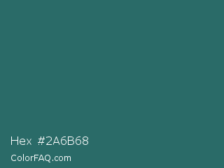 Hex #2a6b68 Color is a dark cyan color and the nearest color is Casal #2f6168. Hex code #2a6b68 and RGB value is rgb(42,107,104). In RGB color space, this color is composed of 16% red, 42% green, 41% blue, In CMYK color space, this color is composed of 61% cyan, 0% magenta, 3% yellow , 58% black , In HSL color space, this color has a hue angle of 177° , 44% saturation and 29% lightness.