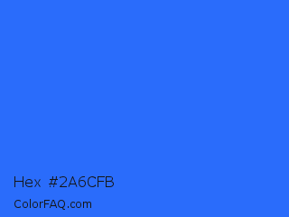 Hex #2a6cfb Color is a normal blue color and the nearest color is Blue Crayola #1f75fe. Hex code #2a6cfb and RGB value is rgb(42,108,251). In RGB color space, this color is composed of 16% red, 42% green, 98% blue, In CMYK color space, this color is composed of 83% cyan, 57% magenta, 0% yellow , 2% black , In HSL color space, this color has a hue angle of 221° , 96% saturation and 57% lightness.