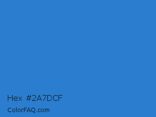 Hex #2a7dcf Color is a normal blue color and the nearest color is Mariner #286acd. Hex code #2a7dcf and RGB value is rgb(42,125,207). In RGB color space, this color is composed of 16% red, 49% green, 81% blue, In CMYK color space, this color is composed of 80% cyan, 40% magenta, 0% yellow , 19% black , In HSL color space, this color has a hue angle of 210° , 66% saturation and 49% lightness.