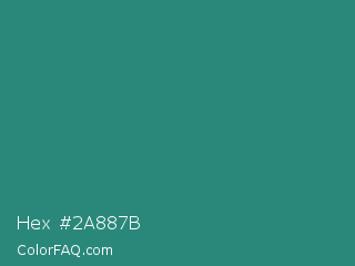 Hex #2a887b Color is a normal cyan color and the nearest color is Celadon Green #2f847c. Hex code #2a887b and RGB value is rgb(42,136,123). In RGB color space, this color is composed of 16% red, 53% green, 48% blue, In CMYK color space, this color is composed of 69% cyan, 0% magenta, 10% yellow , 47% black , In HSL color space, this color has a hue angle of 172° , 53% saturation and 35% lightness.