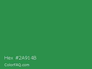 Hex #2a914b Color is a normal green color and the nearest color is Sea Green #2e8b57. Hex code #2a914b and RGB value is rgb(42,145,75). In RGB color space, this color is composed of 16% red, 57% green, 29% blue, In CMYK color space, this color is composed of 71% cyan, 0% magenta, 48% yellow , 43% black , In HSL color space, this color has a hue angle of 139° , 55% saturation and 37% lightness.