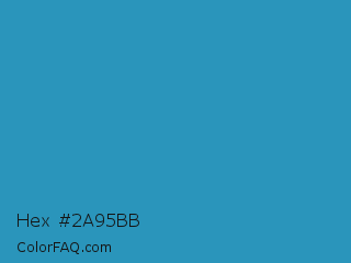 Hex #2a95bb Color is a normal blue color and the nearest color is Eastern Blue #1e9ab0. Hex code #2a95bb and RGB value is rgb(42,149,187). In RGB color space, this color is composed of 16% red, 58% green, 73% blue, In CMYK color space, this color is composed of 78% cyan, 20% magenta, 0% yellow , 27% black , In HSL color space, this color has a hue angle of 196° , 63% saturation and 45% lightness.