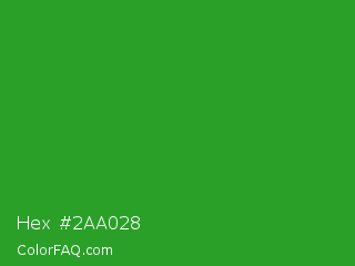 Hex #2aa028 Color is a normal green color and the nearest color is Slimy Green #299617. Hex code #2aa028 and RGB value is rgb(42,160,40). In RGB color space, this color is composed of 16% red, 63% green, 16% blue, In CMYK color space, this color is composed of 74% cyan, 0% magenta, 75% yellow , 37% black , In HSL color space, this color has a hue angle of 119° , 60% saturation and 39% lightness.