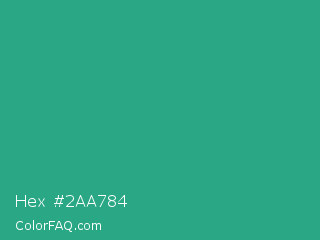 Hex #2aa784 Color is a normal green color and the nearest color is Jungle Green #29ab87. Hex code #2aa784 and RGB value is rgb(42,167,132). In RGB color space, this color is composed of 16% red, 65% green, 52% blue, In CMYK color space, this color is composed of 75% cyan, 0% magenta, 21% yellow , 35% black , In HSL color space, this color has a hue angle of 163° , 60% saturation and 41% lightness.