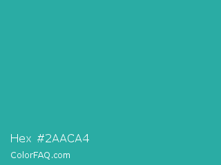 Hex #2aaca4 Color is a normal cyan color and the nearest color is Light Sea Green #20b2aa. Hex code #2aaca4 and RGB value is rgb(42,172,164). In RGB color space, this color is composed of 16% red, 67% green, 64% blue, In CMYK color space, this color is composed of 76% cyan, 0% magenta, 5% yellow , 33% black , In HSL color space, this color has a hue angle of 176° , 61% saturation and 42% lightness.