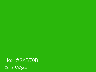 Hex #2ab70b Color is a normal green color and the nearest color is Slimy Green #299617. Hex code #2ab70b and RGB value is rgb(42,183,11). In RGB color space, this color is composed of 16% red, 72% green, 4% blue, In CMYK color space, this color is composed of 77% cyan, 0% magenta, 94% yellow , 28% black , In HSL color space, this color has a hue angle of 109° , 89% saturation and 38% lightness.