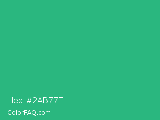 Hex #2ab77f Color is a normal green color and the nearest color is Jungle Green #29ab87. Hex code #2ab77f and RGB value is rgb(42,183,127). In RGB color space, this color is composed of 16% red, 72% green, 50% blue, In CMYK color space, this color is composed of 77% cyan, 0% magenta, 31% yellow , 28% black , In HSL color space, this color has a hue angle of 156° , 63% saturation and 44% lightness.