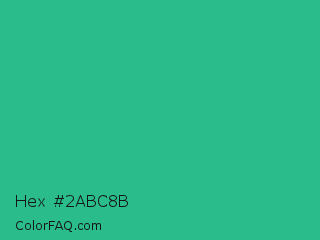 Hex #2abc8b Color is a normal green color and the nearest color is Mountain Meadow #30ba8f. Hex code #2abc8b and RGB value is rgb(42,188,139). In RGB color space, this color is composed of 16% red, 74% green, 55% blue, In CMYK color space, this color is composed of 78% cyan, 0% magenta, 26% yellow , 26% black , In HSL color space, this color has a hue angle of 160° , 63% saturation and 45% lightness.