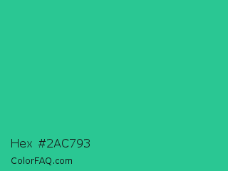 Hex #2ac793 Color is a normal green color and the nearest color is Shamrock #33cc99. Hex code #2ac793 and RGB value is rgb(42,199,147). In RGB color space, this color is composed of 16% red, 78% green, 58% blue, In CMYK color space, this color is composed of 79% cyan, 0% magenta, 26% yellow , 22% black , In HSL color space, this color has a hue angle of 160° , 65% saturation and 47% lightness.
