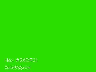 Hex #2ade01 Color is a normal green color and the nearest color is Harlequin #3fff00. Hex code #2ade01 and RGB value is rgb(42,222,1). In RGB color space, this color is composed of 16% red, 87% green, 0% blue, In CMYK color space, this color is composed of 81% cyan, 0% magenta, 100% yellow , 13% black , In HSL color space, this color has a hue angle of 109° , 99% saturation and 44% lightness.