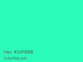 Hex #2afbb8 Color is a normal green color and the nearest color is Turquoise PWG #30d5c8. Hex code #2afbb8 and RGB value is rgb(42,251,184). In RGB color space, this color is composed of 16% red, 98% green, 72% blue, In CMYK color space, this color is composed of 83% cyan, 0% magenta, 27% yellow , 2% black , In HSL color space, this color has a hue angle of 161° , 96% saturation and 57% lightness.