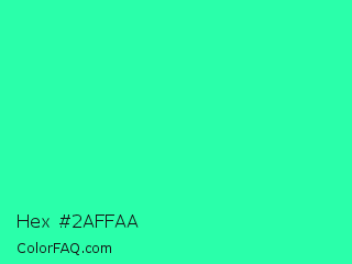 Hex #2affaa Color is a normal green color and the nearest color is Medium Spring Green #00fa9a. Hex code #2affaa and RGB value is rgb(42,255,170). In RGB color space, this color is composed of 16% red, 100% green, 67% blue, In CMYK color space, this color is composed of 84% cyan, 0% magenta, 33% yellow , 0% black , In HSL color space, this color has a hue angle of 156° , 100% saturation and 58% lightness.