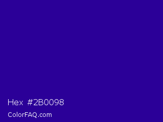 Hex #2b0098 Color is a dark indigo color and the nearest color is Blue Gem #2c0e8c. Hex code #2b0098 and RGB value is rgb(43,0,152). In RGB color space, this color is composed of 17% red, 0% green, 60% blue, In CMYK color space, this color is composed of 72% cyan, 100% magenta, 0% yellow , 40% black , In HSL color space, this color has a hue angle of 257° , 100% saturation and 30% lightness.