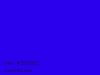 Hex #2b00ec Color is a normal indigo color and the nearest color is Electric Ultramarine #3f00ff. Hex code #2b00ec and RGB value is rgb(43,0,236). In RGB color space, this color is composed of 17% red, 0% green, 93% blue, In CMYK color space, this color is composed of 82% cyan, 100% magenta, 0% yellow , 7% black , In HSL color space, this color has a hue angle of 251° , 100% saturation and 46% lightness.