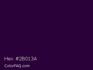 Hex #2b013a Color is a very dark purple color and the nearest color is Mardi Gras #350036. Hex code #2b013a and RGB value is rgb(43,1,58). In RGB color space, this color is composed of 17% red, 0% green, 23% blue, In CMYK color space, this color is composed of 26% cyan, 98% magenta, 0% yellow , 77% black , In HSL color space, this color has a hue angle of 284° , 97% saturation and 12% lightness.