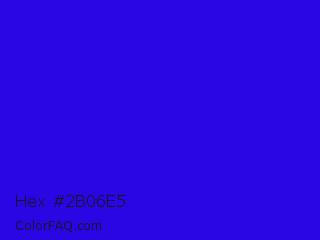 Hex #2b06e5 Color is a normal indigo color and the nearest color is Interdimensional Blue #360ccc. Hex code #2b06e5 and RGB value is rgb(43,6,229). In RGB color space, this color is composed of 17% red, 2% green, 90% blue, In CMYK color space, this color is composed of 81% cyan, 97% magenta, 0% yellow , 10% black , In HSL color space, this color has a hue angle of 250° , 95% saturation and 46% lightness.