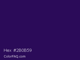 Hex #2b0b59 Color is a very dark violet color and the nearest color is Violent Violet #290c5e. Hex code #2b0b59 and RGB value is rgb(43,11,89). In RGB color space, this color is composed of 17% red, 4% green, 35% blue, In CMYK color space, this color is composed of 52% cyan, 88% magenta, 0% yellow , 65% black , In HSL color space, this color has a hue angle of 265° , 78% saturation and 20% lightness.