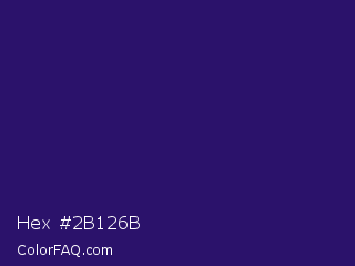 Hex #2b126b Color is a dark indigo color and the nearest color is Paris M #26056a. Hex code #2b126b and RGB value is rgb(43,18,107). In RGB color space, this color is composed of 17% red, 7% green, 42% blue, In CMYK color space, this color is composed of 60% cyan, 83% magenta, 0% yellow , 58% black , In HSL color space, this color has a hue angle of 257° , 71% saturation and 25% lightness.