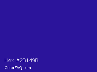 Hex #2b149b Color is a normal indigo color and the nearest color is Blue Gem #2c0e8c. Hex code #2b149b and RGB value is rgb(43,20,155). In RGB color space, this color is composed of 17% red, 8% green, 61% blue, In CMYK color space, this color is composed of 72% cyan, 87% magenta, 0% yellow , 39% black , In HSL color space, this color has a hue angle of 250° , 77% saturation and 34% lightness.