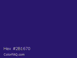 Hex #2b1670 Color is a dark indigo color and the nearest color is Persian Indigo #32127a. Hex code #2b1670 and RGB value is rgb(43,22,112). In RGB color space, this color is composed of 17% red, 9% green, 44% blue, In CMYK color space, this color is composed of 62% cyan, 80% magenta, 0% yellow , 56% black , In HSL color space, this color has a hue angle of 254° , 67% saturation and 26% lightness.