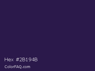 Hex #2b194b Color is a very dark violet color and the nearest color is Valhalla #2b194f. Hex code #2b194b and RGB value is rgb(43,25,75). In RGB color space, this color is composed of 17% red, 10% green, 29% blue, In CMYK color space, this color is composed of 43% cyan, 67% magenta, 0% yellow , 71% black , In HSL color space, this color has a hue angle of 262° , 50% saturation and 20% lightness.