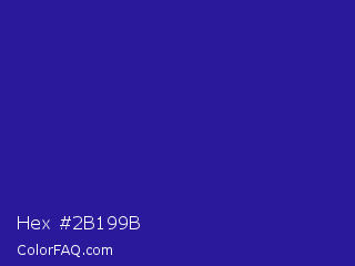 Hex #2b199b Color is a normal indigo color and the nearest color is Blue Gem #2c0e8c. Hex code #2b199b and RGB value is rgb(43,25,155). In RGB color space, this color is composed of 17% red, 10% green, 61% blue, In CMYK color space, this color is composed of 72% cyan, 84% magenta, 0% yellow , 39% black , In HSL color space, this color has a hue angle of 248° , 72% saturation and 35% lightness.