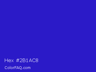 Hex #2b1ac8 Color is a normal indigo color and the nearest color is Interdimensional Blue #360ccc. Hex code #2b1ac8 and RGB value is rgb(43,26,200). In RGB color space, this color is composed of 17% red, 10% green, 78% blue, In CMYK color space, this color is composed of 79% cyan, 87% magenta, 0% yellow , 22% black , In HSL color space, this color has a hue angle of 246° , 77% saturation and 44% lightness.