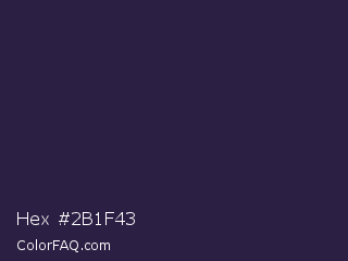 Hex #2b1f43 Color is a very dark indigo color and the nearest color is Ebony Clay #26283b. Hex code #2b1f43 and RGB value is rgb(43,31,67). In RGB color space, this color is composed of 17% red, 12% green, 26% blue, In CMYK color space, this color is composed of 36% cyan, 54% magenta, 0% yellow , 74% black , In HSL color space, this color has a hue angle of 260° , 37% saturation and 19% lightness.