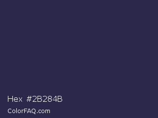 Hex #2b284b Color is a dark indigo color and the nearest color is Port Gore #251f4f. Hex code #2b284b and RGB value is rgb(43,40,75). In RGB color space, this color is composed of 17% red, 16% green, 29% blue, In CMYK color space, this color is composed of 43% cyan, 47% magenta, 0% yellow , 71% black , In HSL color space, this color has a hue angle of 245° , 30% saturation and 23% lightness.
