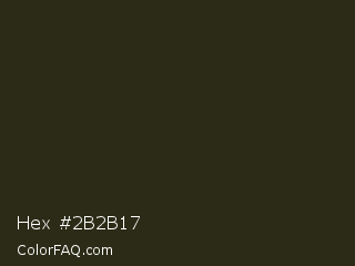 Hex #2b2b17 Color is a very dark yellow color and the nearest color is Black Olive #242e16. Hex code #2b2b17 and RGB value is rgb(43,43,23). In RGB color space, this color is composed of 17% red, 17% green, 9% blue, In CMYK color space, this color is composed of 0% cyan, 0% magenta, 47% yellow , 83% black , In HSL color space, this color has a hue angle of 60° , 30% saturation and 13% lightness.