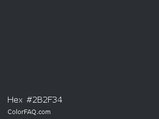 Hex #2b2f34 Color is a very dark blue color and the nearest color is Charade #292937. Hex code #2b2f34 and RGB value is rgb(43,47,52). In RGB color space, this color is composed of 17% red, 18% green, 20% blue, In CMYK color space, this color is composed of 17% cyan, 10% magenta, 0% yellow , 80% black , In HSL color space, this color has a hue angle of 213° , 9% saturation and 19% lightness.