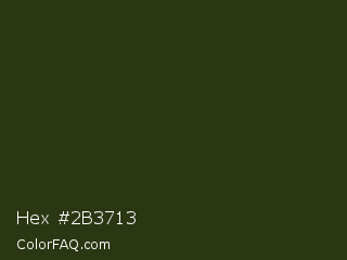 Hex #2b3713 Color is a very dark green color and the nearest color is Turtle Green #2a380b. Hex code #2b3713 and RGB value is rgb(43,55,19). In RGB color space, this color is composed of 17% red, 22% green, 7% blue, In CMYK color space, this color is composed of 22% cyan, 0% magenta, 65% yellow , 78% black , In HSL color space, this color has a hue angle of 80° , 49% saturation and 15% lightness.