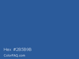 Hex #2b5b9b Color is a normal blue color and the nearest color is Cyan Cobalt Blue #28589c. Hex code #2b5b9b and RGB value is rgb(43,91,155). In RGB color space, this color is composed of 17% red, 36% green, 61% blue, In CMYK color space, this color is composed of 72% cyan, 41% magenta, 0% yellow , 39% black , In HSL color space, this color has a hue angle of 214° , 57% saturation and 39% lightness.