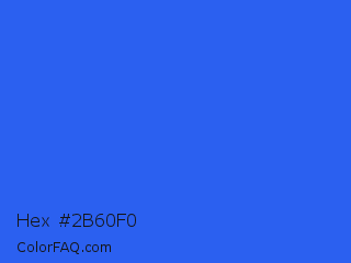 Hex #2b60f0 Color is a normal blue color and the nearest color is Ultramarine Blue #4166f5. Hex code #2b60f0 and RGB value is rgb(43,96,240). In RGB color space, this color is composed of 17% red, 38% green, 94% blue, In CMYK color space, this color is composed of 82% cyan, 60% magenta, 0% yellow , 6% black , In HSL color space, this color has a hue angle of 224° , 87% saturation and 55% lightness.