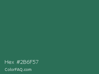 Hex #2b6f57 Color is a dark green color and the nearest color is Amazon #3b7a57. Hex code #2b6f57 and RGB value is rgb(43,111,87). In RGB color space, this color is composed of 17% red, 44% green, 34% blue, In CMYK color space, this color is composed of 61% cyan, 0% magenta, 22% yellow , 56% black , In HSL color space, this color has a hue angle of 159° , 44% saturation and 30% lightness.