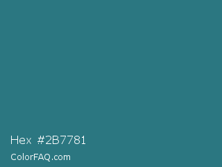 Hex #2b7781 Color is a normal cyan color and the nearest color is Paradiso #317d82. Hex code #2b7781 and RGB value is rgb(43,119,129). In RGB color space, this color is composed of 17% red, 47% green, 51% blue, In CMYK color space, this color is composed of 67% cyan, 8% magenta, 0% yellow , 49% black , In HSL color space, this color has a hue angle of 187° , 50% saturation and 34% lightness.