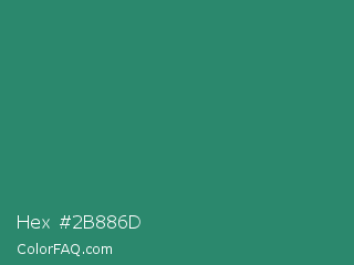 Hex #2b886d Color is a normal green color and the nearest color is Illuminating Emerald #319177. Hex code #2b886d and RGB value is rgb(43,136,109). In RGB color space, this color is composed of 17% red, 53% green, 43% blue, In CMYK color space, this color is composed of 68% cyan, 0% magenta, 20% yellow , 47% black , In HSL color space, this color has a hue angle of 163° , 52% saturation and 35% lightness.