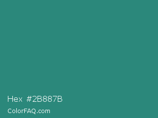 Hex #2b887b Color is a normal cyan color and the nearest color is Celadon Green #2f847c. Hex code #2b887b and RGB value is rgb(43,136,123). In RGB color space, this color is composed of 17% red, 53% green, 48% blue, In CMYK color space, this color is composed of 68% cyan, 0% magenta, 10% yellow , 47% black , In HSL color space, this color has a hue angle of 172° , 52% saturation and 35% lightness.
