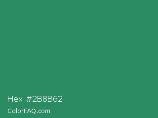 Hex #2b8b62 Color is a normal green color and the nearest color is Eucalyptus #278a5b. Hex code #2b8b62 and RGB value is rgb(43,139,98). In RGB color space, this color is composed of 17% red, 55% green, 38% blue, In CMYK color space, this color is composed of 69% cyan, 0% magenta, 29% yellow , 45% black , In HSL color space, this color has a hue angle of 154° , 53% saturation and 36% lightness.
