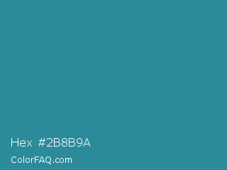 Hex #2b8b9a Color is a normal cyan color and the nearest color is Jelly Bean #297b9a. Hex code #2b8b9a and RGB value is rgb(43,139,154). In RGB color space, this color is composed of 17% red, 55% green, 60% blue, In CMYK color space, this color is composed of 72% cyan, 10% magenta, 0% yellow , 40% black , In HSL color space, this color has a hue angle of 188° , 56% saturation and 39% lightness.