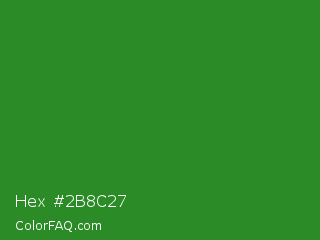 Hex #2b8c27 Color is a normal green color and the nearest color is Forest Green #228b22. Hex code #2b8c27 and RGB value is rgb(43,140,39). In RGB color space, this color is composed of 17% red, 55% green, 15% blue, In CMYK color space, this color is composed of 69% cyan, 0% magenta, 72% yellow , 45% black , In HSL color space, this color has a hue angle of 118° , 56% saturation and 35% lightness.