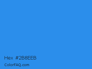Hex #2b8eeb Color is a normal blue color and the nearest color is Bleu De France #318ce7. Hex code #2b8eeb and RGB value is rgb(43,142,235). In RGB color space, this color is composed of 17% red, 56% green, 92% blue, In CMYK color space, this color is composed of 82% cyan, 40% magenta, 0% yellow , 8% black , In HSL color space, this color has a hue angle of 209° , 83% saturation and 55% lightness.