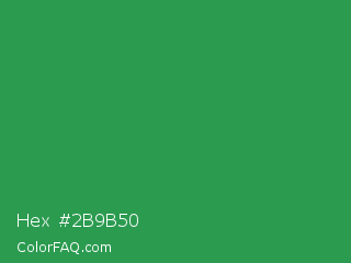 Hex #2b9b50 Color is a normal green color and the nearest color is Sea Green #2e8b57. Hex code #2b9b50 and RGB value is rgb(43,155,80). In RGB color space, this color is composed of 17% red, 61% green, 31% blue, In CMYK color space, this color is composed of 72% cyan, 0% magenta, 48% yellow , 39% black , In HSL color space, this color has a hue angle of 140° , 57% saturation and 39% lightness.