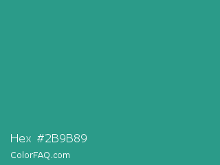 Hex #2b9b89 Color is a normal cyan color and the nearest color is Lochinvar #2c8c84. Hex code #2b9b89 and RGB value is rgb(43,155,137). In RGB color space, this color is composed of 17% red, 61% green, 54% blue, In CMYK color space, this color is composed of 72% cyan, 0% magenta, 12% yellow , 39% black , In HSL color space, this color has a hue angle of 170° , 57% saturation and 39% lightness.